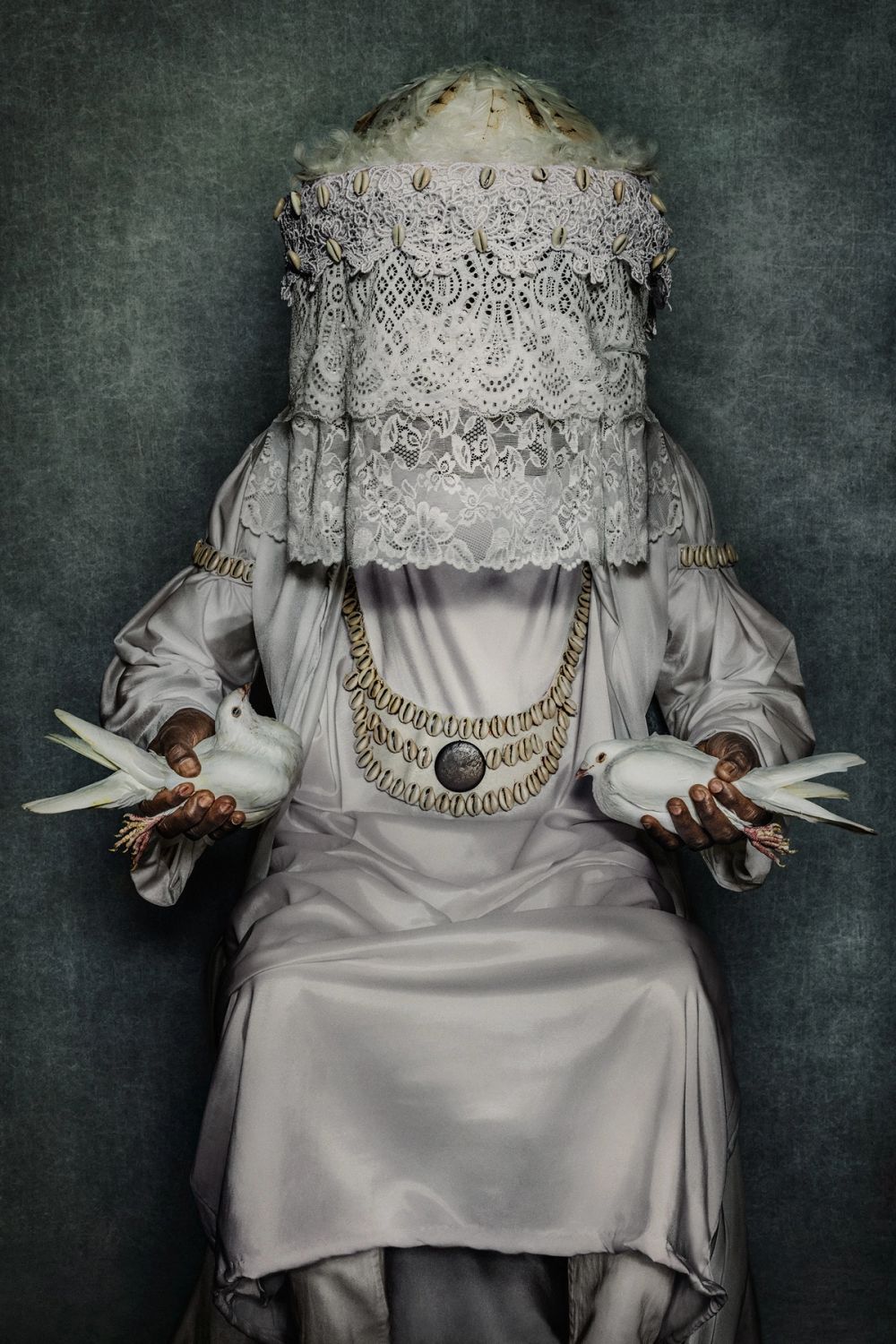 A devotee of the Orisha Obatalá photographed by Mario Testino in Cuba, wearing ceremonial white dress as part of the A Beautiful World series.