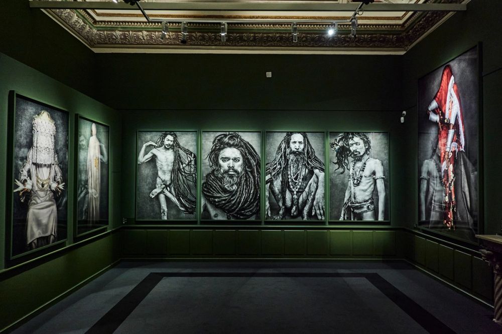 Four framed portraits of Hindu ascetics titled Holy Men by Mario Testino, displayed in A Beautiful World exhibition at Palazzo Bonaparte, Rome, 2024.