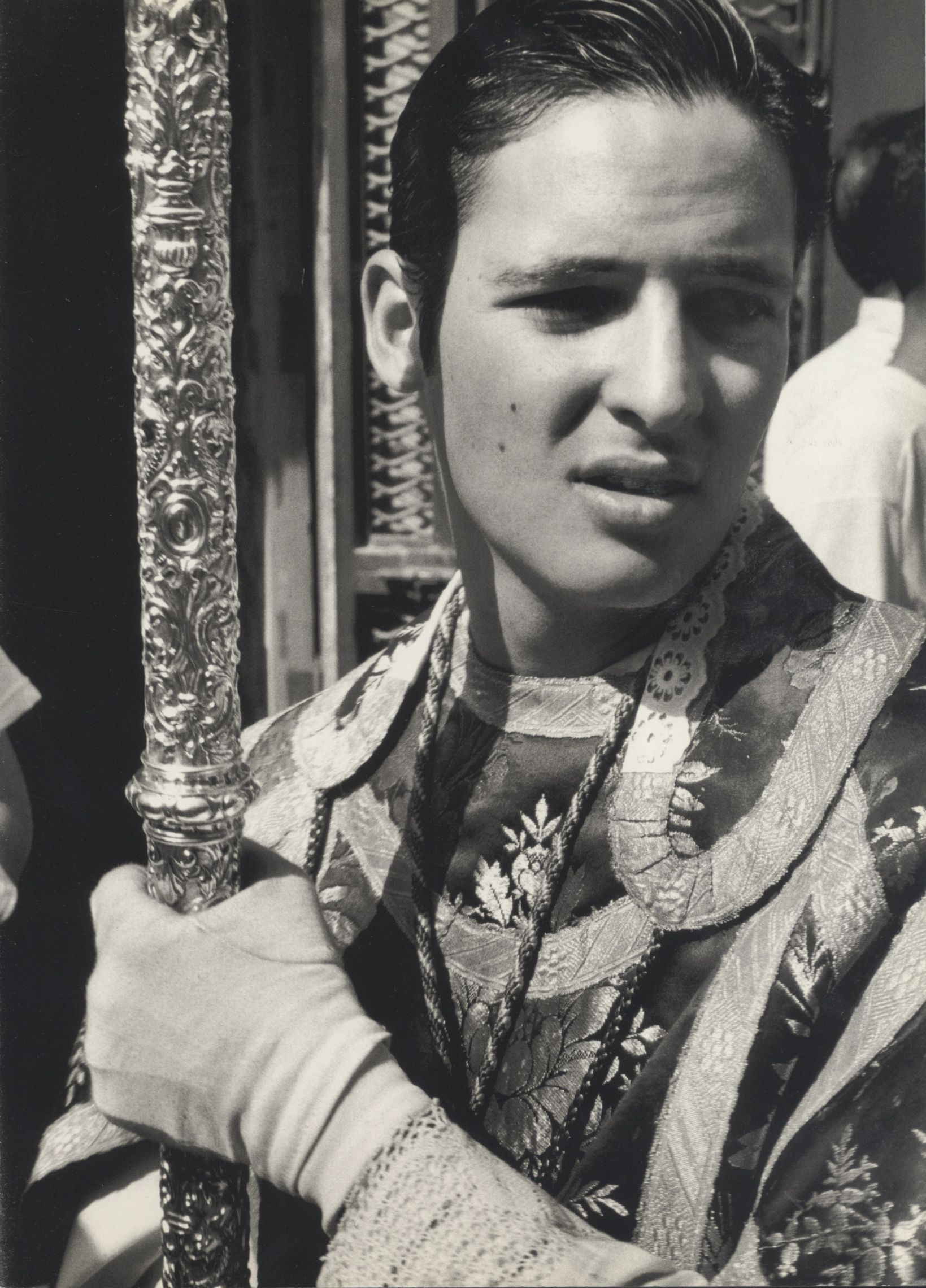 A man in a religious procession in Spain photographed by Mario Testino, showing participants in ceremonial dress during a Catholic ritual.