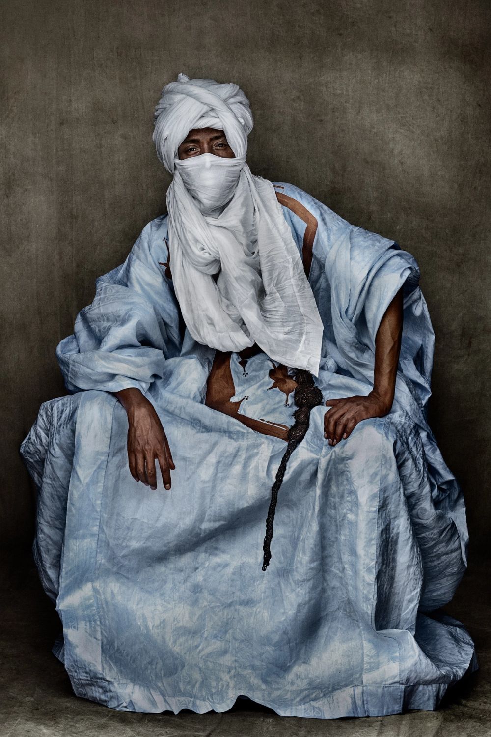 In Morocco, this takes the form of movement. Testino has said of the Sahrawi men that he was “obsessed” from the first time he saw them, drawn to the proportions created by textiles blowing in the wind. It is a revealing remark, because it shows exactly where the fashion eye becomes something broader. Fabric here is not mere garment. It becomes architecture. It catches air, extends the body, produces volume, creates line. The winding of a Sahrawi turban is not simply practical, nor symbolic alone, but a skill passed from one person to another, a transformation that turns flat cloth into shape, identity and authority. The image records not only what is worn, but what it takes to make that form possible.