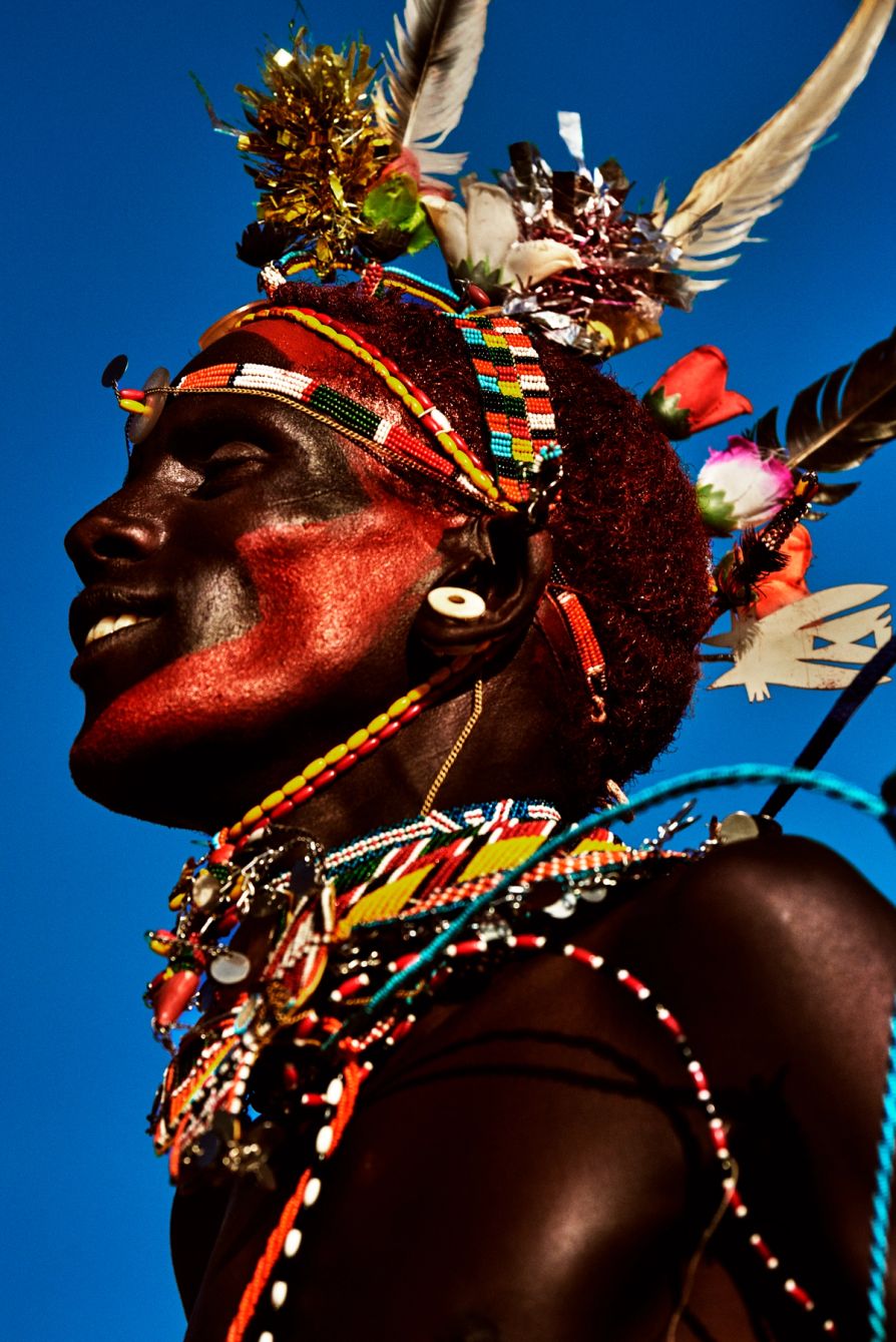 Testino has said that one of the things that most fascinates him are the similarities he encounters across continents, the way forms in Asia might echo South America or Africa, or how African visual systems may carry surprising parallels with Europe. But what is striking in the African work is how that global perspective never erases specificity. Each community remains exactly itself. The photographs do not absorb difference into a larger cosmopolitan blur. They hold it in place.