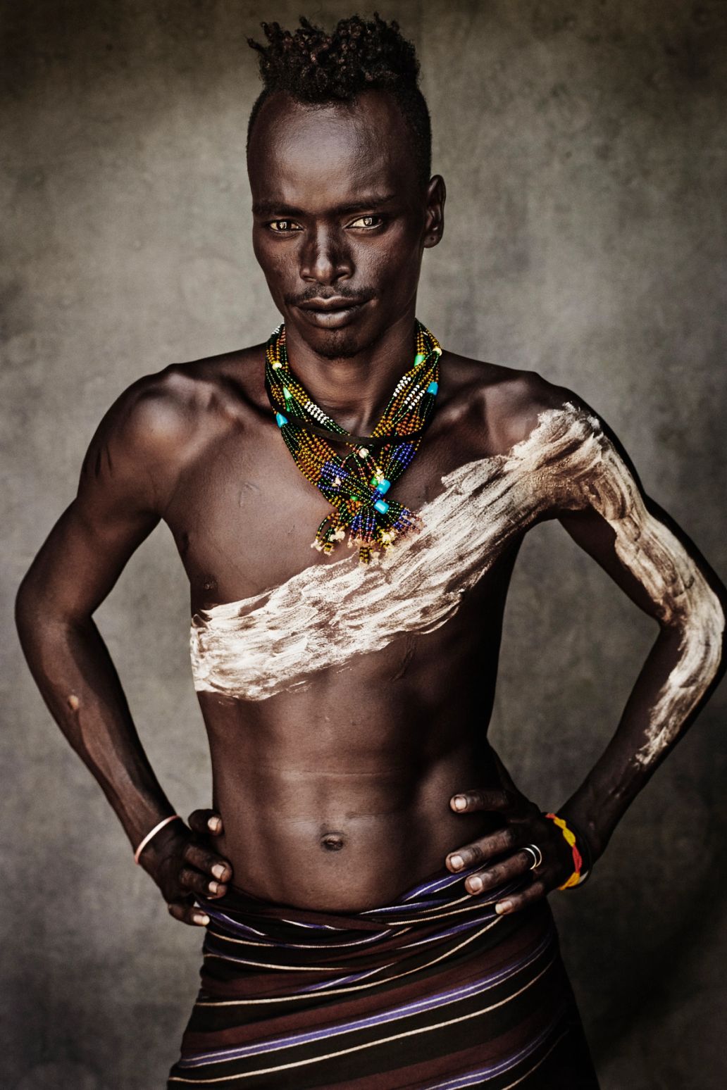 What emerges across these journeys is not a single image of Africa, nor a flattening of its cultures into one visual thesis. Quite the opposite. The work insists on difference. The Maasai, Samburu, Pokot and Turkana in Kenya. The Mursi, Suri, Kara and Dassanach in Ethiopia. The Himba and Herero in Namibia. The Sahrawi and Tekna in Morocco. Nubian communities in Egypt. Laamb wrestlers in Senegal. Kuba and Pende traditions in the Democratic Republic of the Congo. Each appears not as part of a survey, but as a complete visual language in its own right. Dress, adornment, paint, jewellery, textiles, posture, hair, ritual, all of it functioning not as decoration, but as structure. Not as embellishment, but as a way of making identity visible.