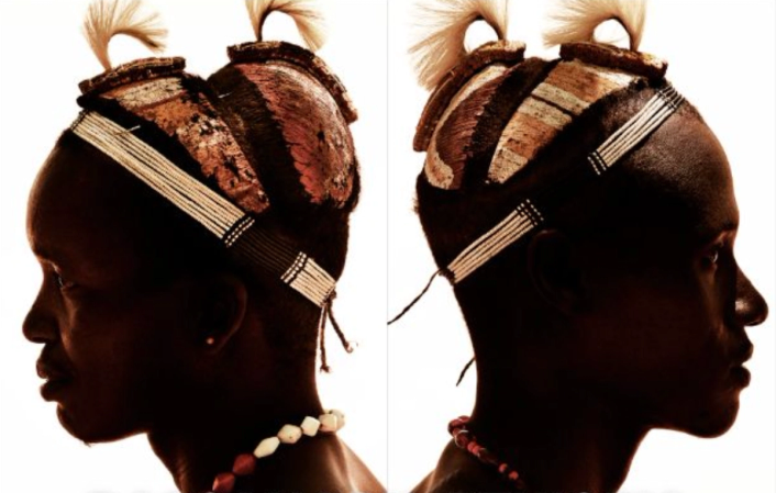 In Kenya and Ethiopia, the body itself becomes a more immediate site of inscription. Among Turkana communities, jewellery accumulates with such density and precision that it begins to operate as a second skin, carrying status, social position and the rhythms of life within its weight. Testino noted of the Turkana women that even within shared codes of dress, each maintains “a very defined style of their own.” That insistence on individuality within collective systems runs throughout the project. It is there again in the Dassanach portraits from Ethiopia, where the visual force lies not in theatricality, but in compression. In those close, head-and-shoulder views, the frame tightens until hair, ornament, profile and skin carry the entire burden of the image. The result is severe, exacting, unforgettable. Nothing in the composition asks for spectacle, yet the effect is arresting. You are made to confront structure itself: how a hairstyle becomes social language, how the contour of a head can carry the weight of heritage.
