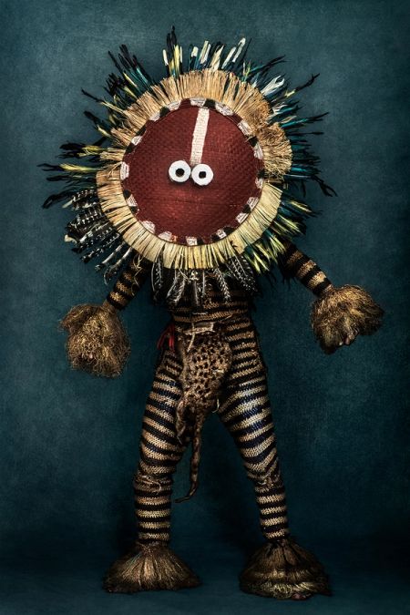 It makes sense when considered against the history behind the work. The Pende masquerades are not decorative inventions but structures of authority shaped by ritual, hierarchy and resistance. Exhibition notes connect the Munganji Wa Weso costumes to anti-colonial revolt and to systems of ancestral force that continue to exert power in the present. In Testino’s photographs, they do not appear as curiosities or relics. They arrive as complete figures, carrying social and spiritual order within their form. They ask the viewer to meet them at the level of seriousness they already possess.
