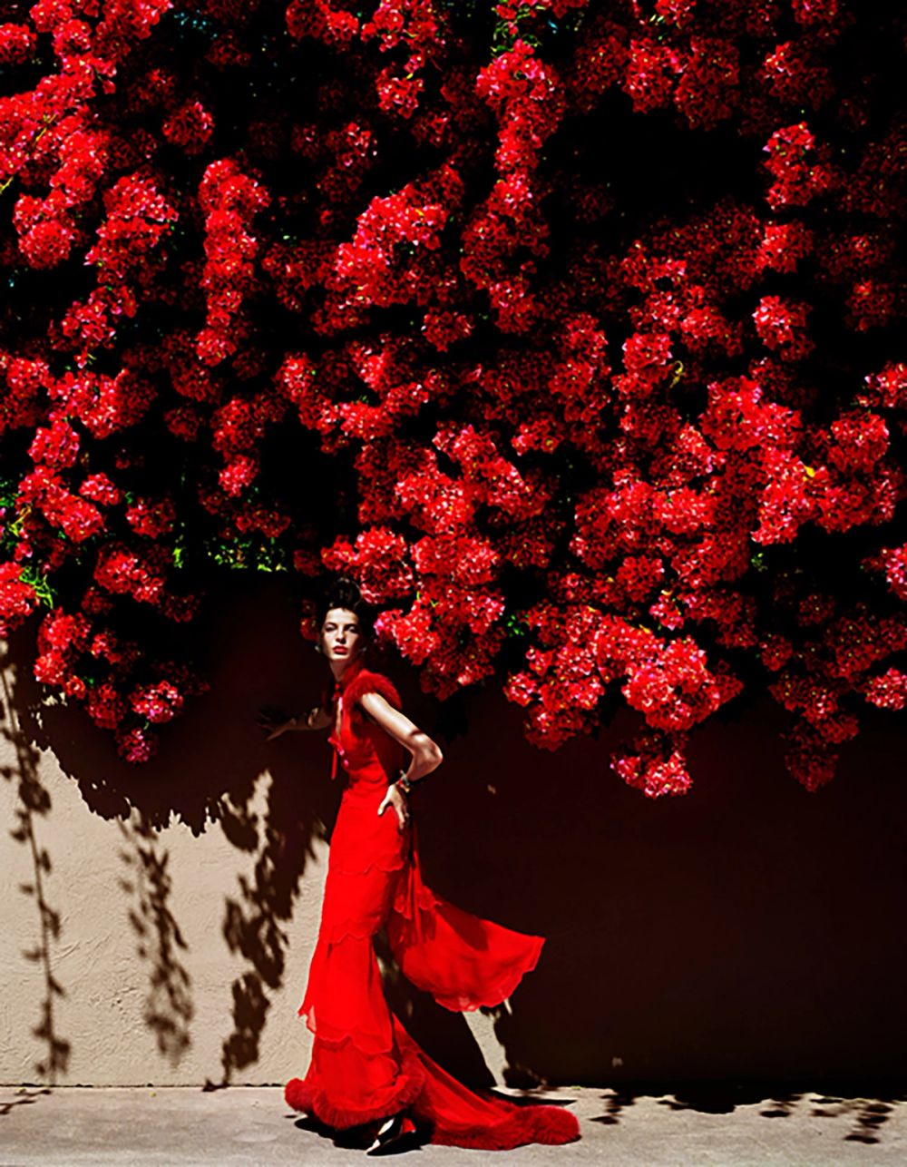 There are images that circulate so widely they begin to detach from their origin. They become shorthand: a color, a mood, a feeling remembered more than understood. Mario Testino’s photograph of Daria Werbowy in a scarlet Yves Saint Laurent Rive Gauche dress, standing beneath an explosion of bougainvillea in Los Angeles, is one of those rare artifacts.