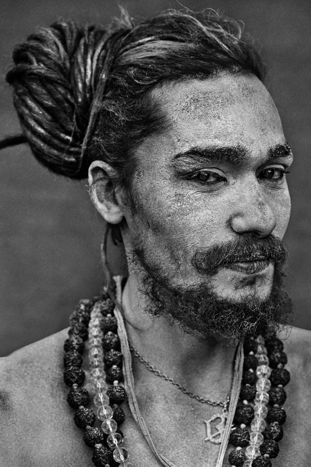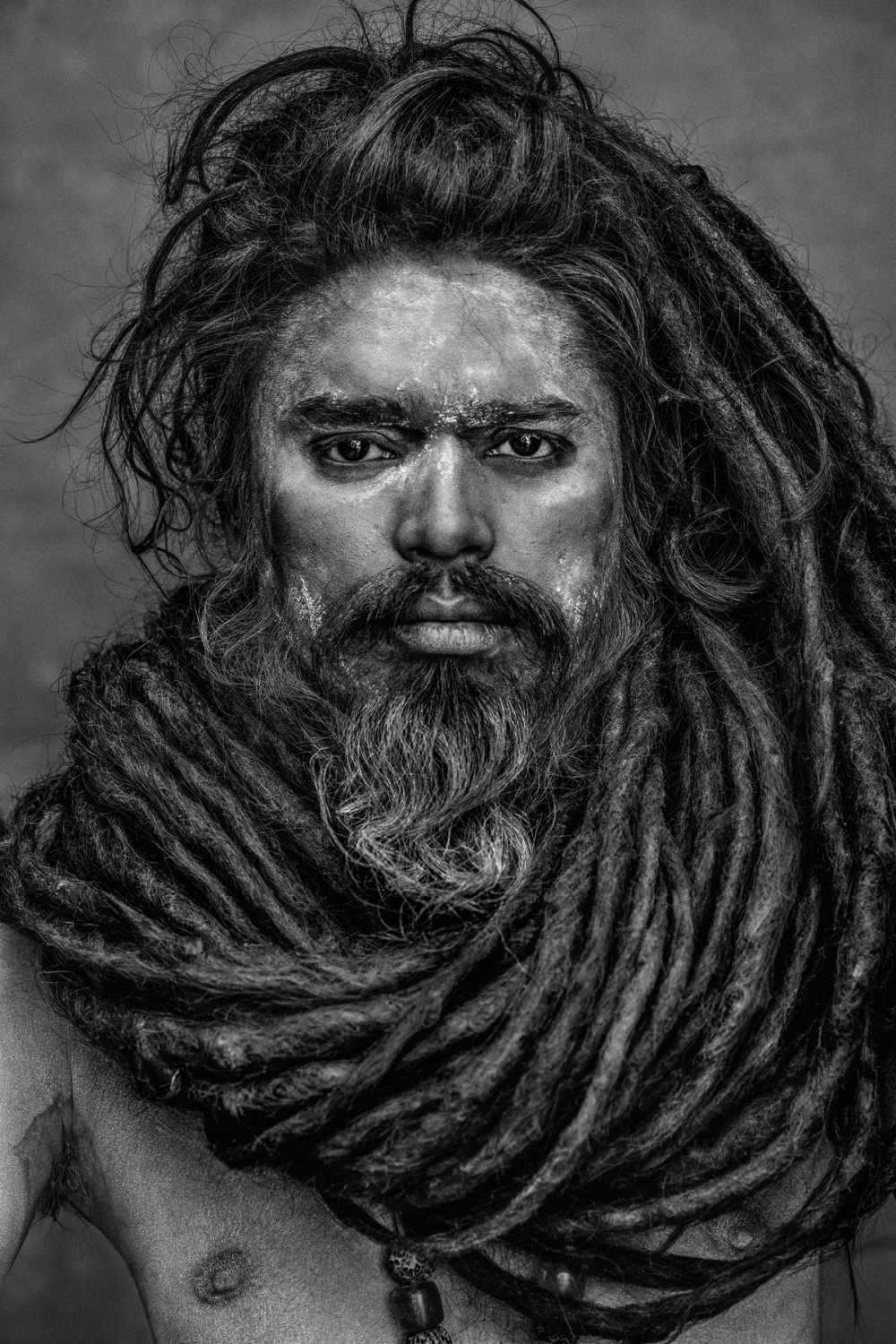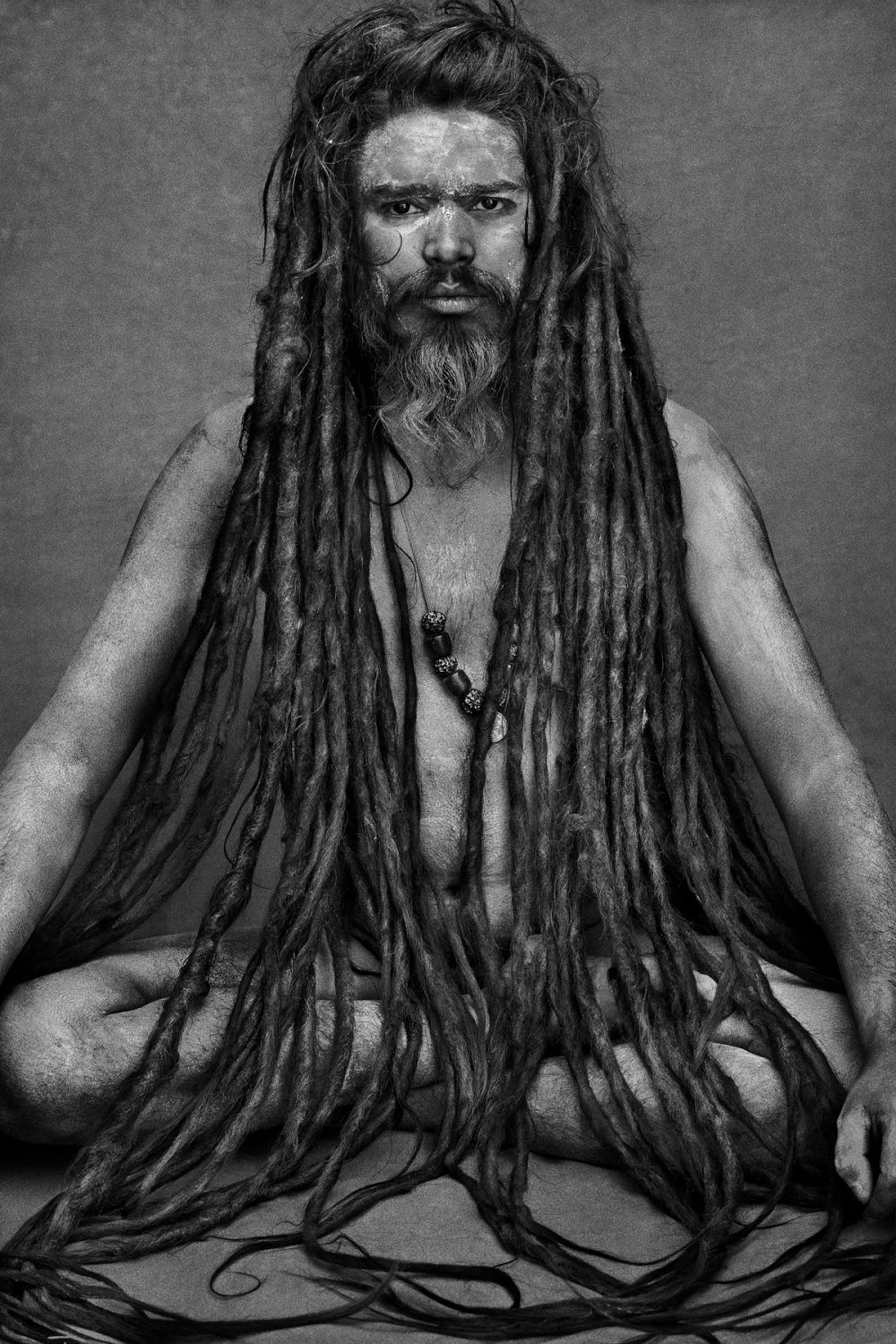 Ash settles across the skin in intricate, almost topographical patterns. Hair, left to grow without intervention, becomes time made visible. Matted, weighted, extending beyond the body, it carries years of discipline, years of refusal.