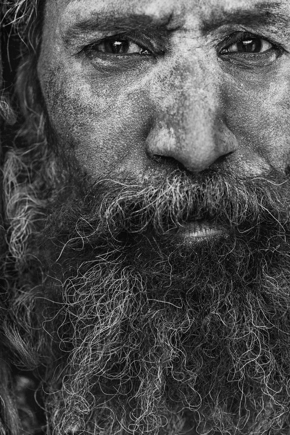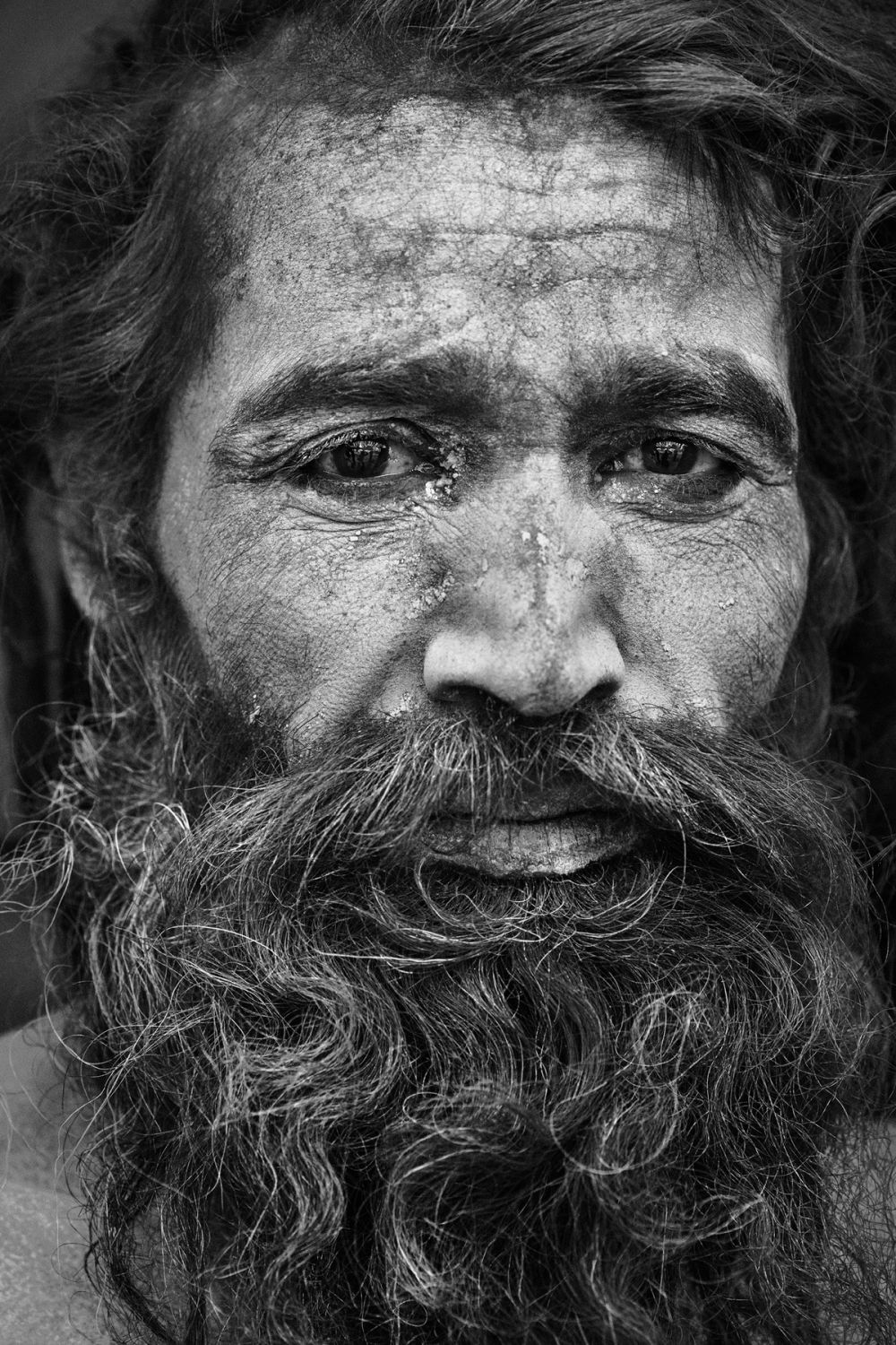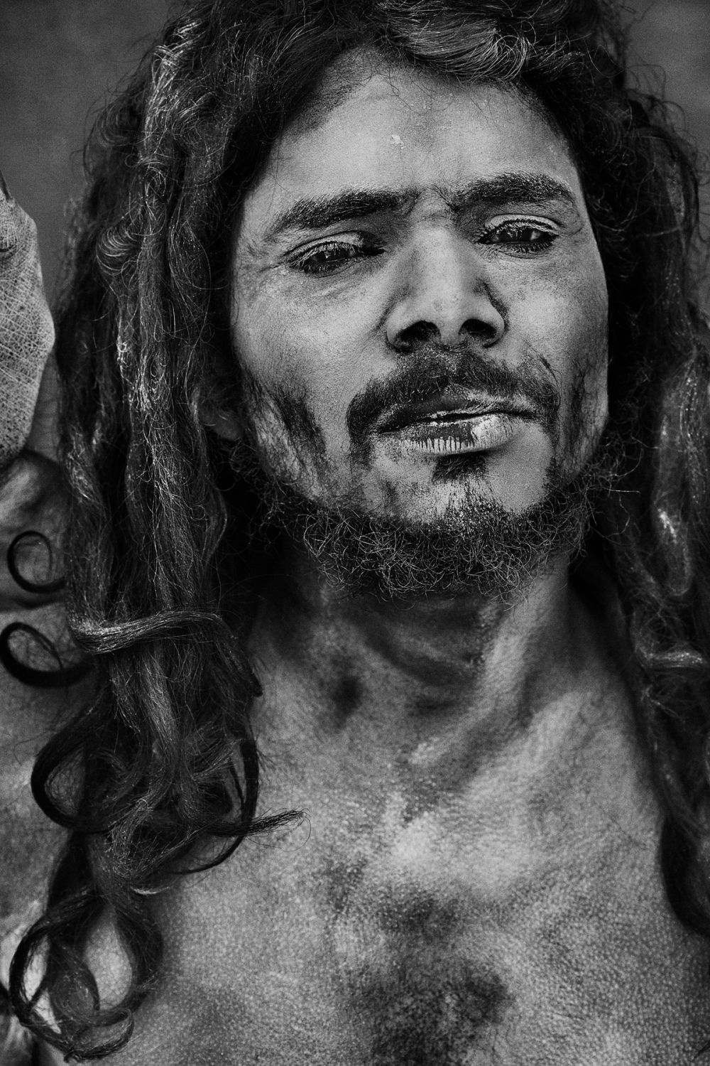 Ash settles across the skin in intricate, almost topographical patterns. Hair, left to grow without intervention, becomes time made visible. Matted, weighted, extending beyond the body, it carries years of discipline, years of refusal.
