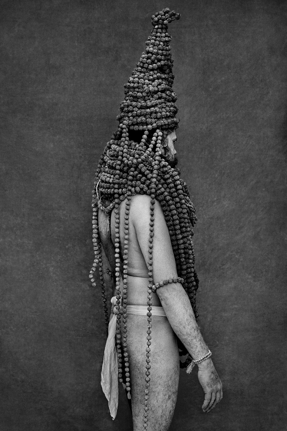 The power of this body of work, centred on the sadhus, lies in a radical act of isolation. Each man is photographed against a neutral grey ground, removed entirely from the visual intensity of the Kumbh Mela. There is no river, no fire, no trace of the gathering that surrounds them. By removing the context that often reduces such subjects to mere tourism, the image refuses spectacle and returns to the individual. The effect is immediate, and disarming. The sadhu is no longer part of a mass, but an encounter.