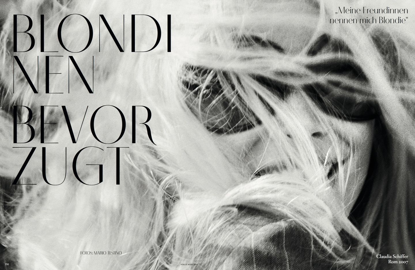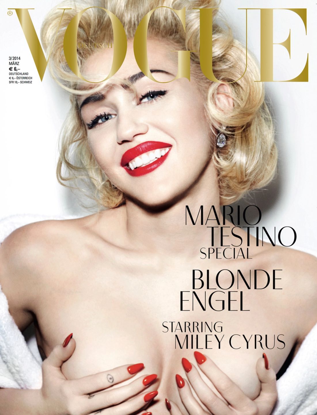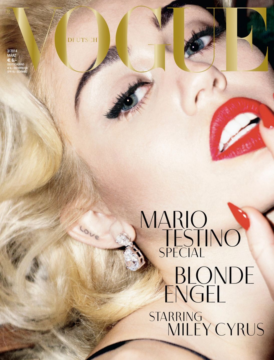 Six years after Christiane Arp first invited Testino to guest edit German Vogue, he was asked back by Arp to work on a second special issue for March 2014. In a Marilyn Monroe/Madonna inspired shoot, Testino again chose a blonde for the cover, this time in the notorious form of pop icon Miley Cyrus. Dedicated to the theme Blonde, the issue includes powerful blondes from singer Sky Ferreira, as well as models Anja Rubik, Esmeralda Seay Reynolds, Candice Swanepoel and Edita Vilkeviciute.