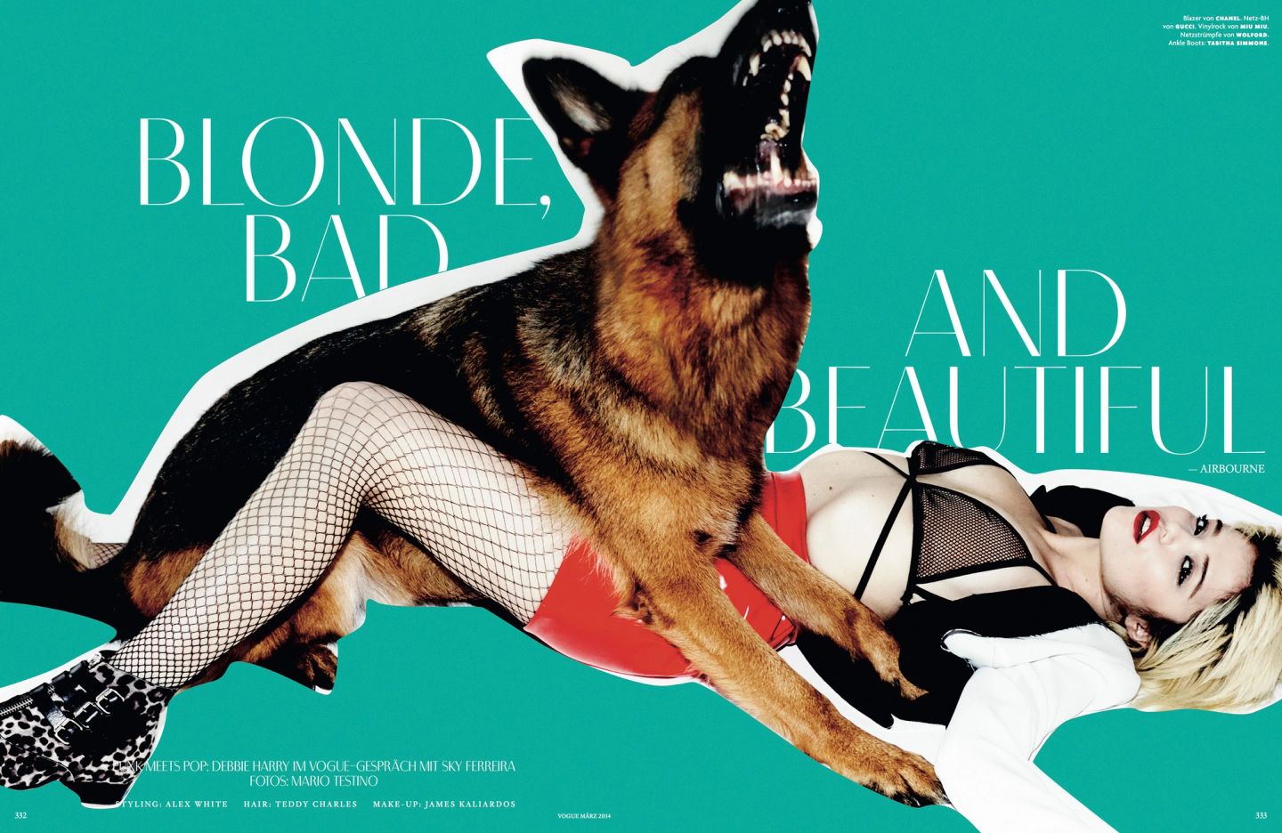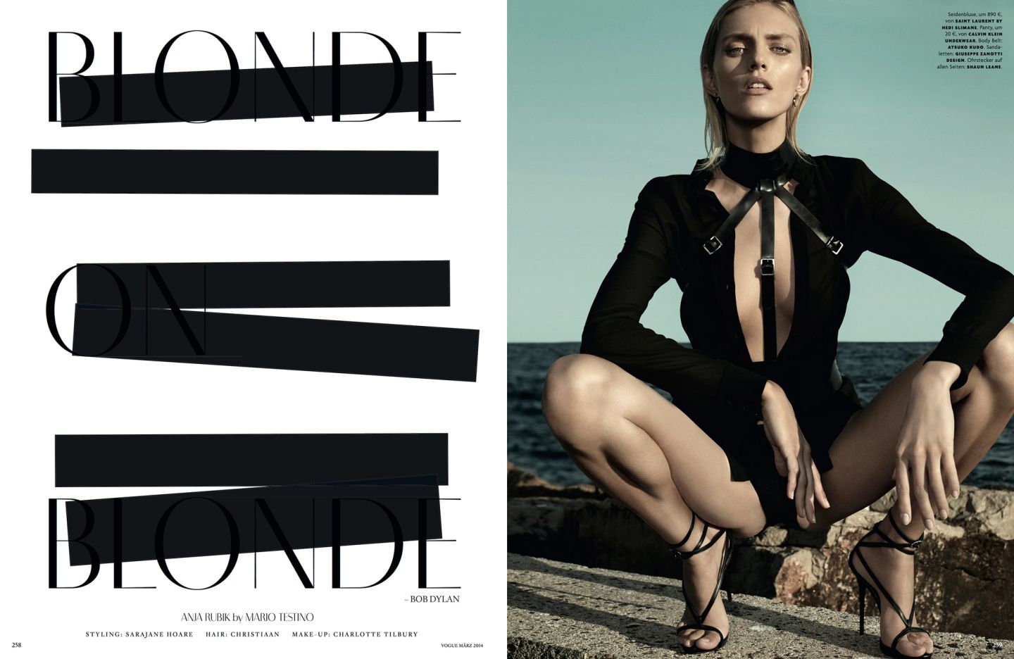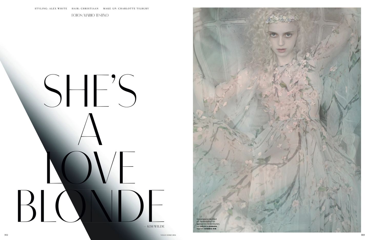 Six years after Christiane Arp first invited Testino to guest edit German Vogue, he was asked back by Arp to work on a second special issue for March 2014. In a Marilyn Monroe/Madonna inspired shoot, Testino again chose a blonde for the cover, this time in the notorious form of pop icon Miley Cyrus. Dedicated to the theme Blonde, the issue includes powerful blondes from singer Sky Ferreira, as well as models Anja Rubik, Esmeralda Seay Reynolds, Candice Swanepoel and Edita Vilkeviciute.