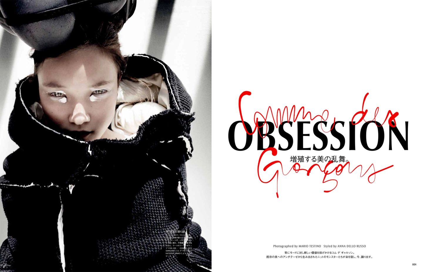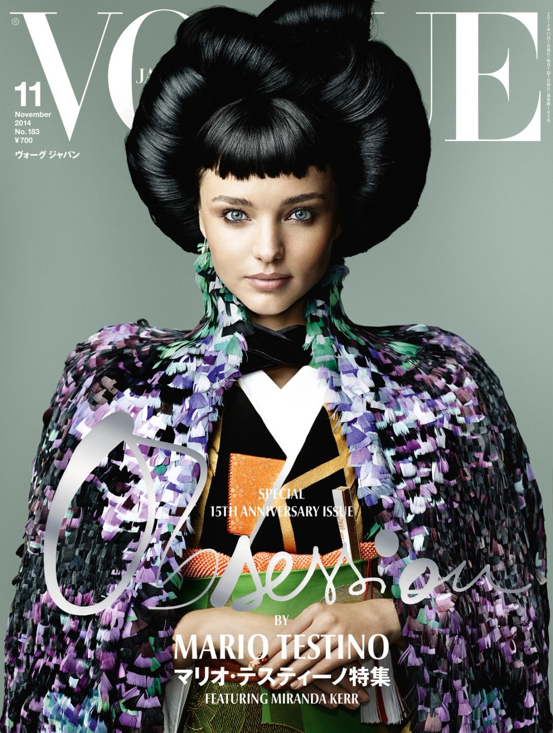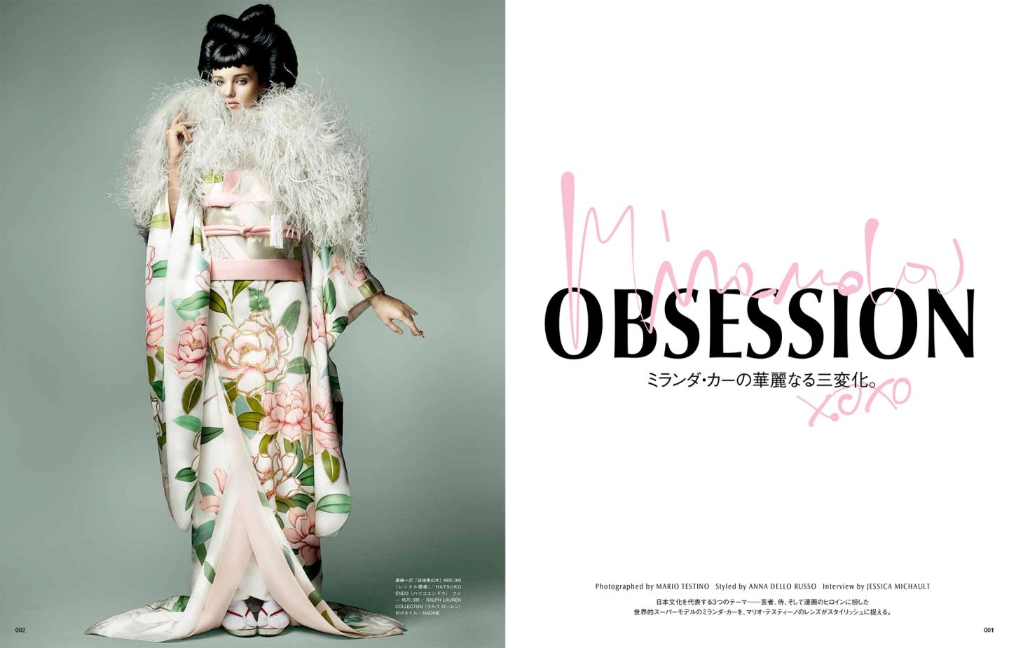 In celebration of Vogue Japan’s 15th year, Mario Testino was invited to be the magazine’s first ever guest editor. Intensifying the spirit of unwavering conviction that he had noticed after years of travelling to and from the country, Testino worked closely with editor Mitsuko Watanabe and fashion director Anna Dello Russo to explore the theme of Obsession. Gracing the special six-page cover is model Miranda Kerr dressed in an array of attire in the style of geisha, samurai and manga; all representative archetypes of Japanese culture and dress.