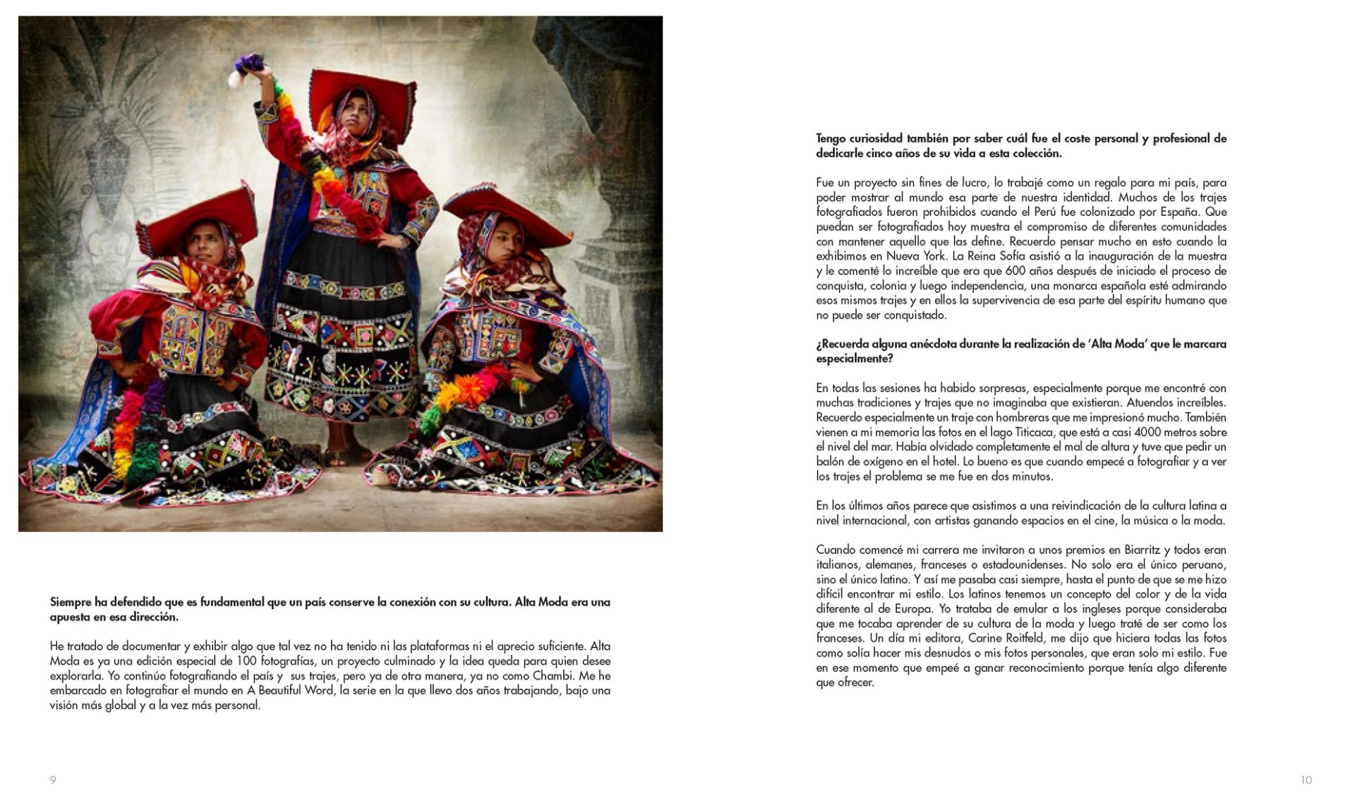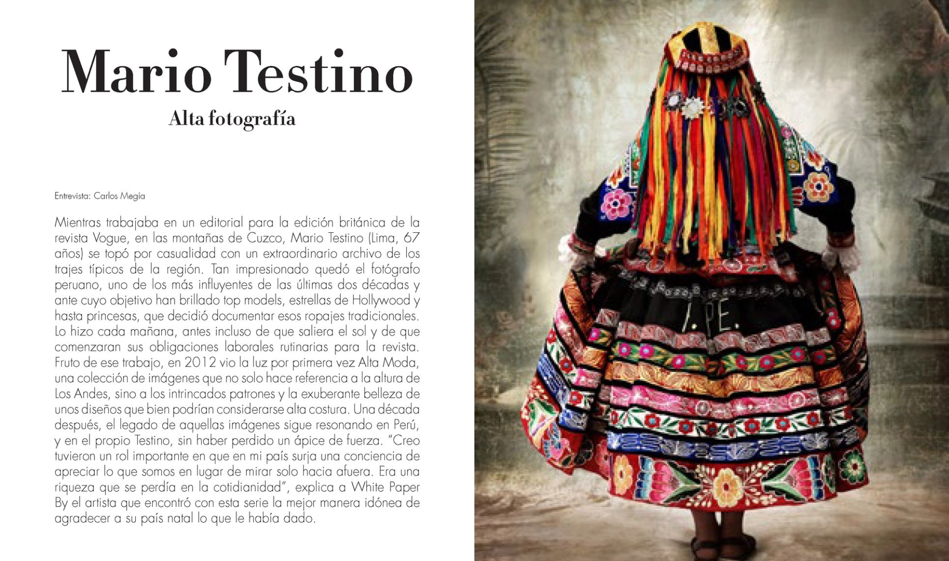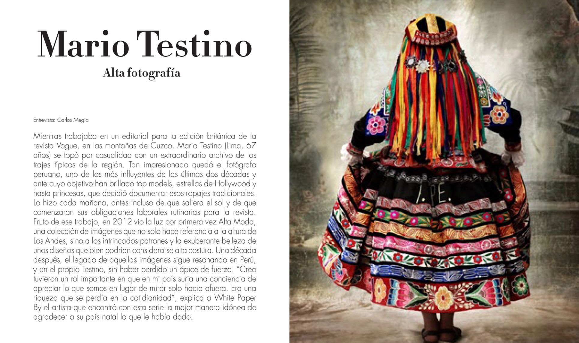 In this in-depth 2022 cover feature, WhitePaperBy explores Mario Testino’s celebrated series Alta Moda, a body of work rooted in the traditional dress of the Andean highlands. In conversation with Carlos Megía, Testino reflects on discovering the archive of regional costumes while on assignment for British Vogue in Cuzco and how that moment evolved into a multi-year documentation project. Alta Moda became both an artistic homage and a cultural offering to Peru, drawing on influences from Martín Chambi and capturing the elegance, pride and identity expressed through traditional dress. Testino discusses the project’s personal and national significance, its emotional impact on audiences, and how it shaped his understanding of legacy, heritage and photographic responsibility.
