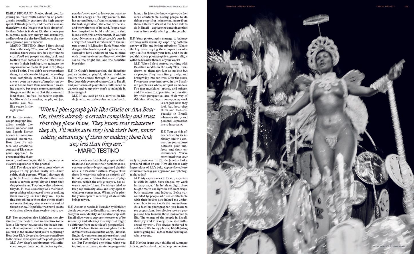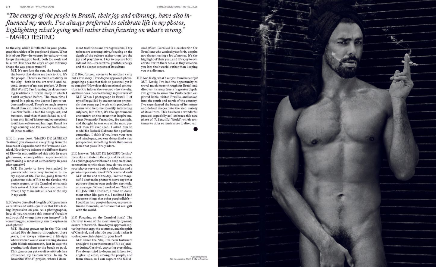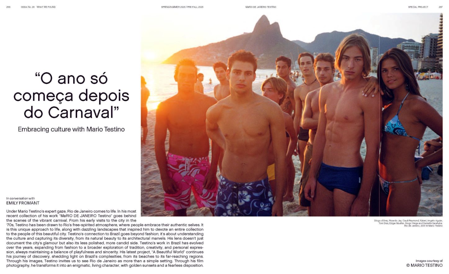 In this special feature for ODDA No. 28, Mario Testino revisits the sensual, sun-drenched world of MaRIO DE JANEIRO Testino. Speaking with Emily Fromant, he reflects on Rio de Janeiro’s spirit of freedom, its architectural rhythm, and the raw authenticity that has shaped his vision for decades. More than a fashion story, the feature captures Testino’s enduring connection to Brazil, a country that continues to inspire his global project A Beautiful World.
